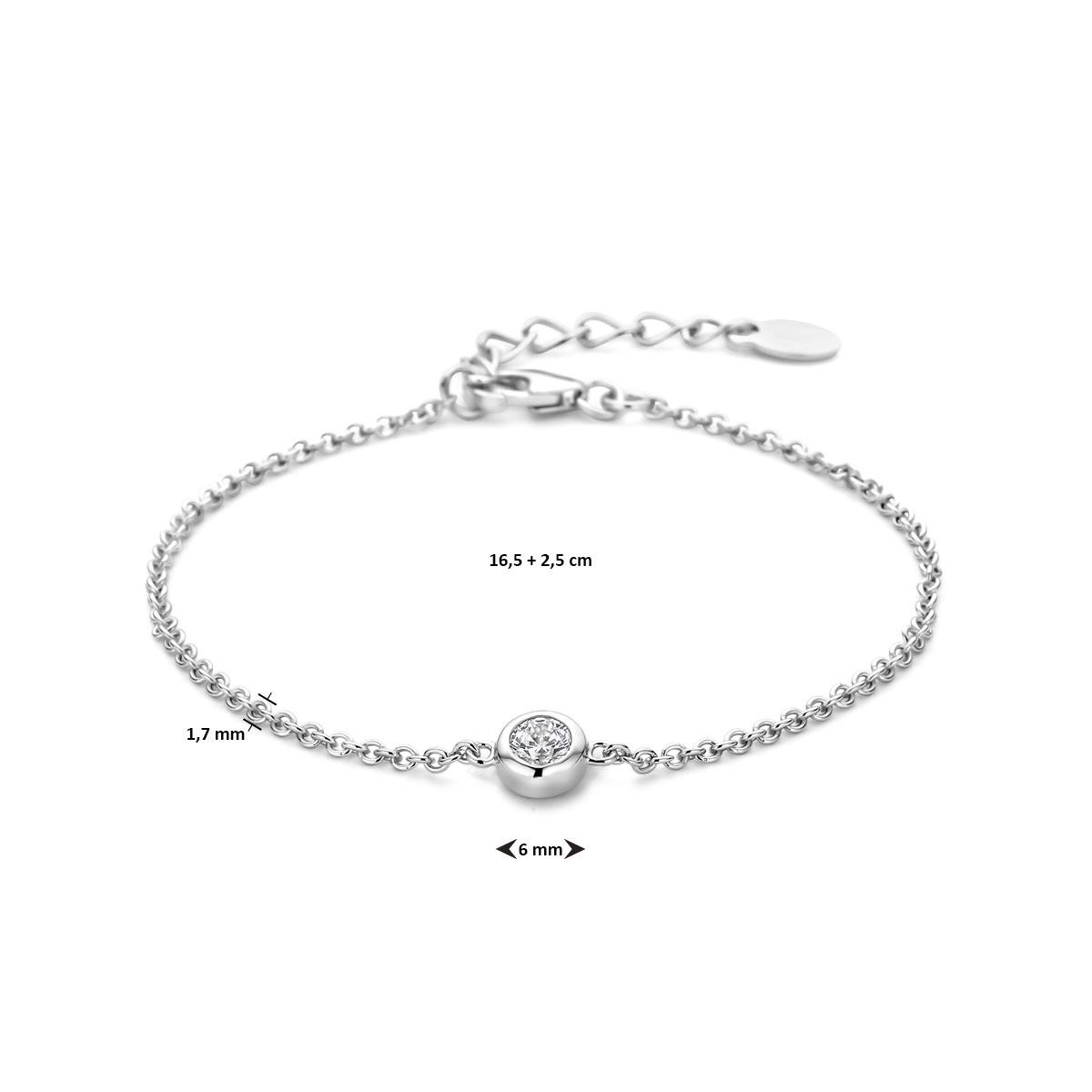 Gerhodineerd 925 zilveren armband met zirkonia. De lengte bedraagt 16.5cm met 1.5cm extensie en de schakelbreedte is 1.7mm.