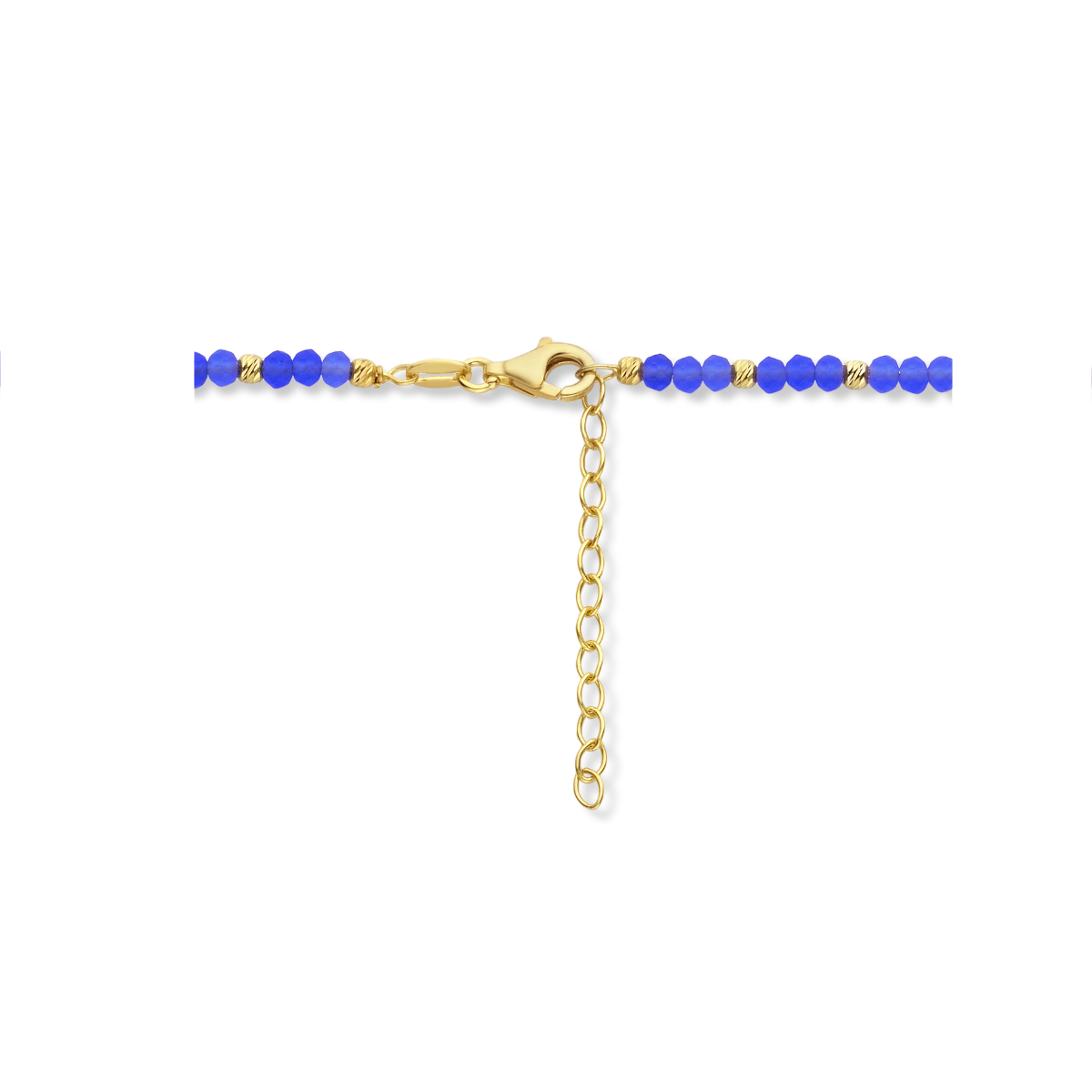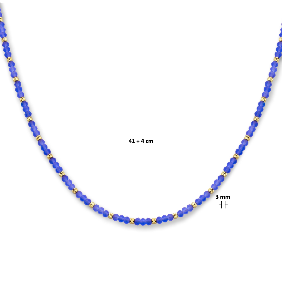 Geelgoud op 925 zilveren collier uitgevoerd met blauw glas en een karabijn sluiting. Het collier heeft een draaglengte van 41cm en een extensie van 4cm. Geen garantie op plating.