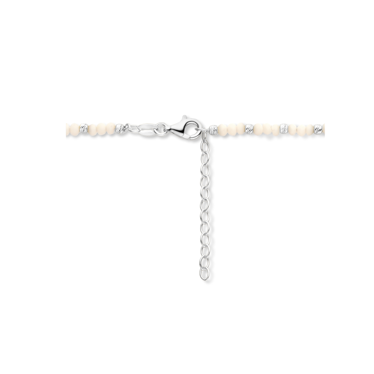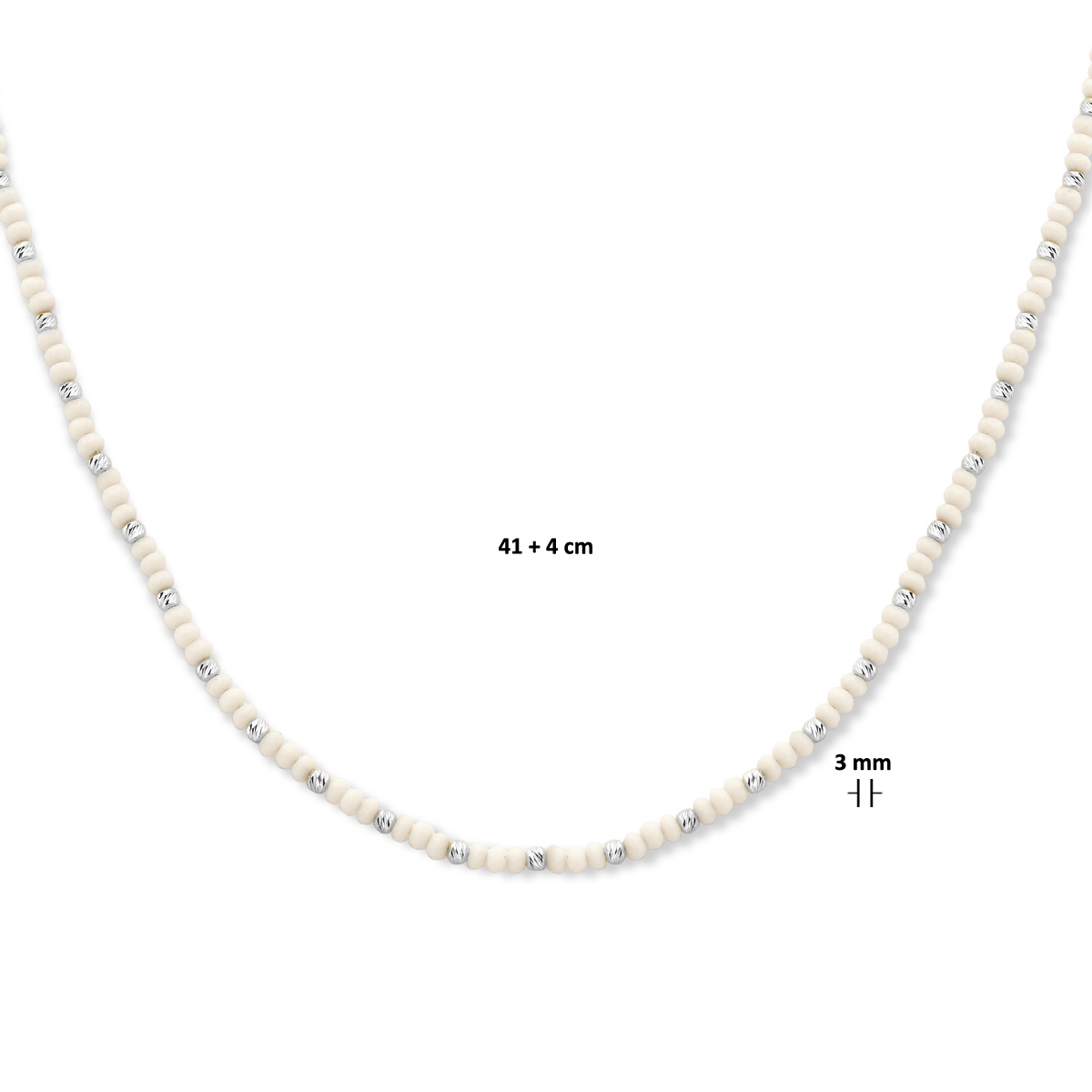 Gerhodineerd 925 zilveren collier uitgevoerd met wit glas en een karabijn sluiting. Het collier heeft een draaglengte van 41cm en een extensie van 4cm.
