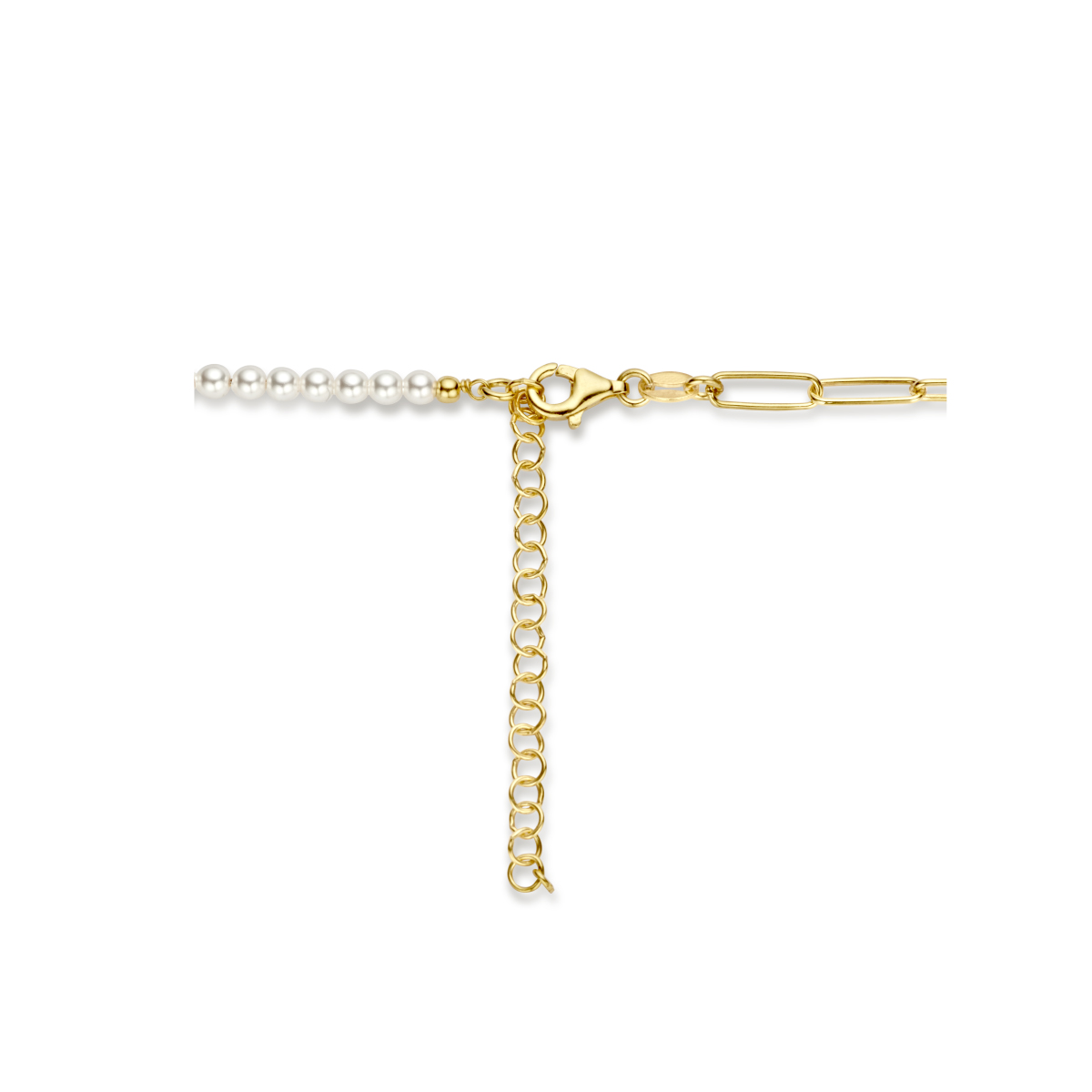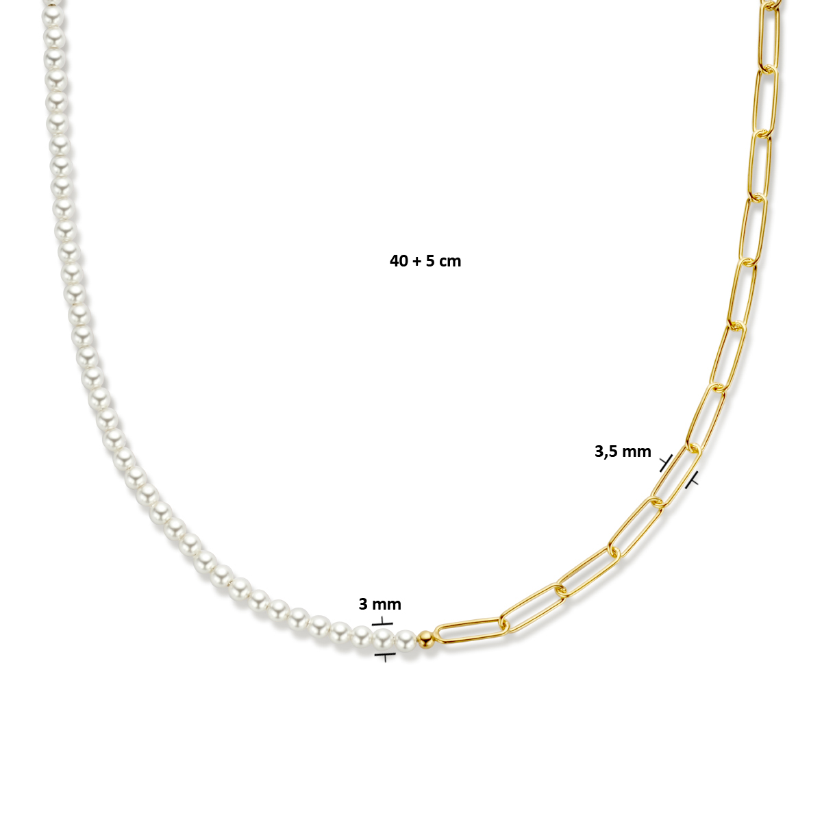 Geelgoud op 925 zilveren collier met synthetische parels. Het collier heeft een draaglengte van 40cm en een extensie van 5cm. De schakelbreedte is 3.5mm. Uitgevoerd met een karabijn sluiting. Geen garantie op plating.