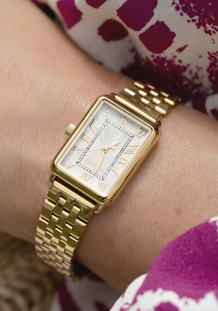 ZINZI Elegance bicolor horloge witte wijzerplaat en rechthoekige goudkleurige  kast en geel vergulde stalen schakelband 28mm extra dun ZIW1907GB