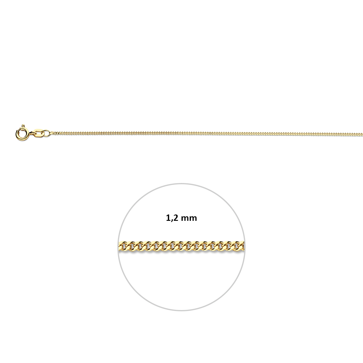 Verguld op 925 zilveren gourmette collier met een schakelbreedte van 1.2mm. Het collier heeft een draaglengte van 41cm en een extensie van 4cm. Geen garantie op plating.