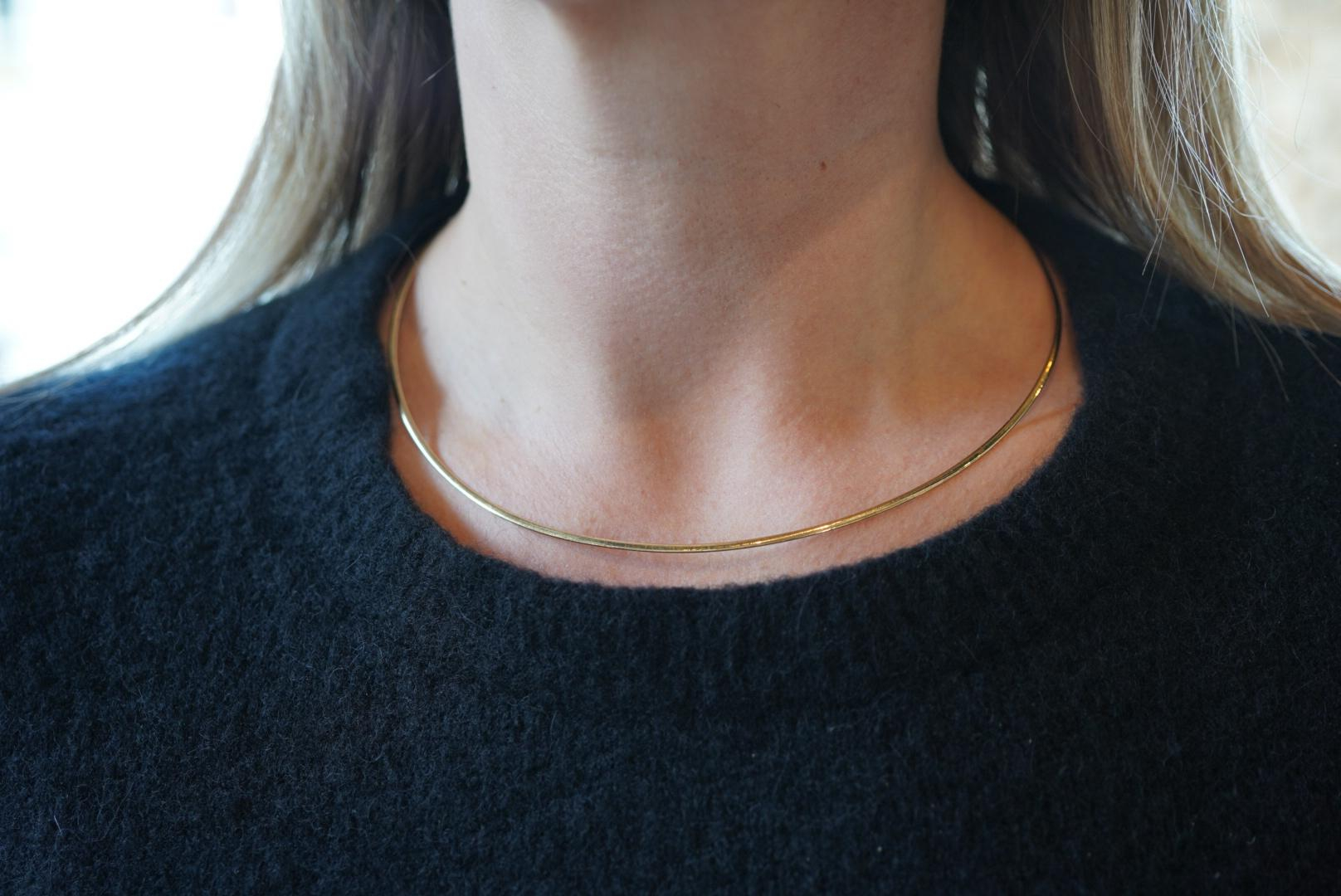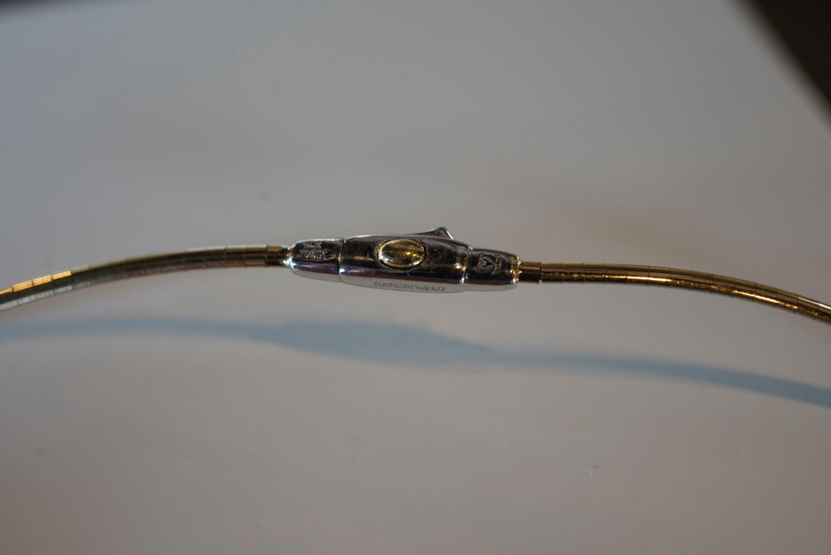 Zo goed als nieuw omega collier, in bicolour uitgevoerd. Witgoud aan de ene kant, geelgoud aan de andere kant. Met prachtig uitgevoerde sluiting, voorzien van het officiele Nederlands keurteken voor 14 karaat. 7,5 gram, 45 CM.