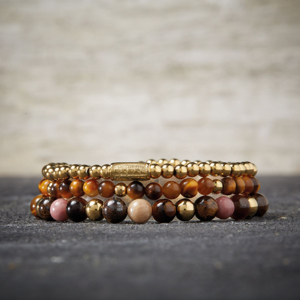 Armband van het merk Rebel & Rose. De armband heeft een hoogwaardige elastische stretch koord, met 4mm van Tijgeroog, RVS ion-gold plated.