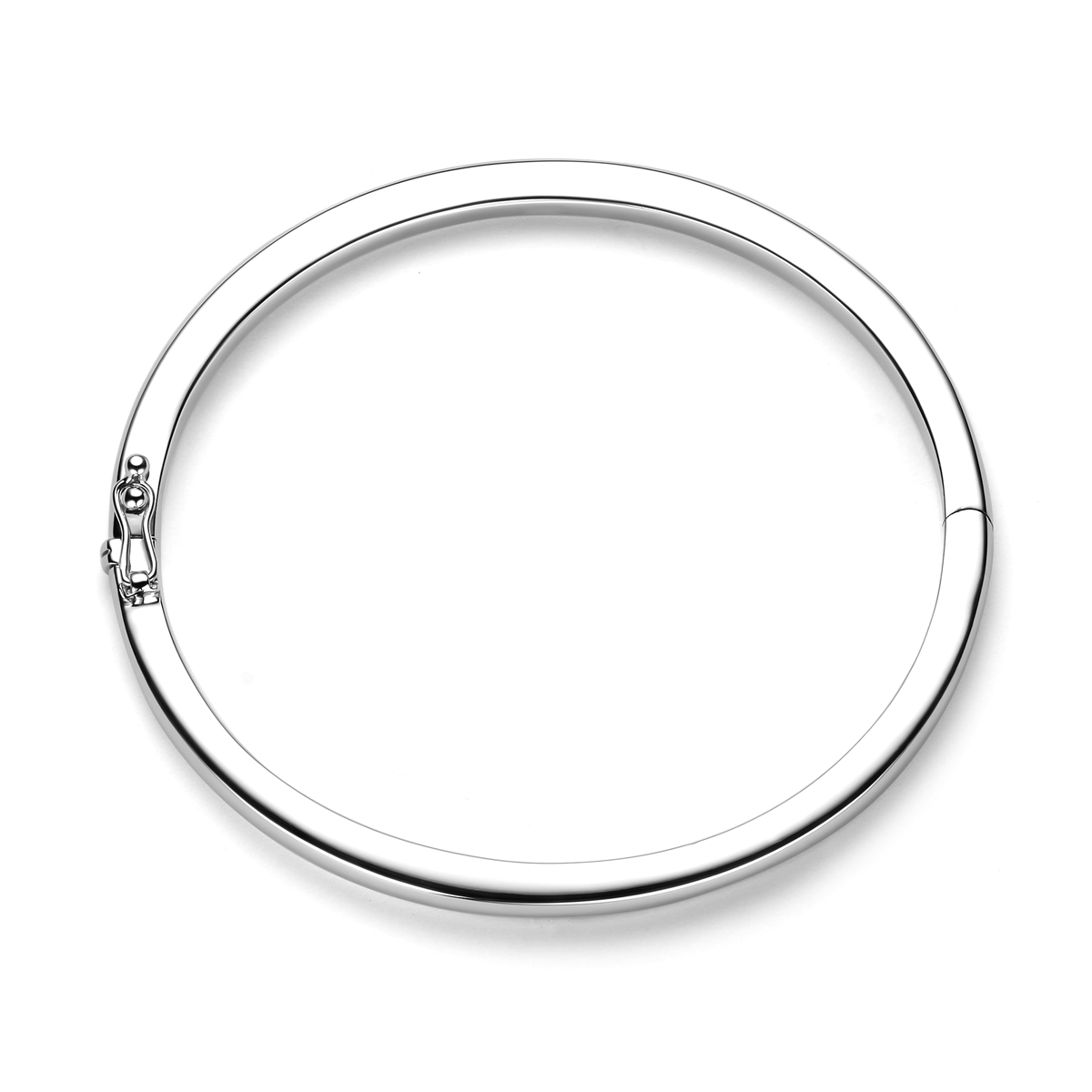 Modern gerhodineerd zilveren bangle van 60x4mm uitgevoerd met een stevige scharnier sluiting. Door het strakke design is deze bangle gemakkelijk te combineren met andere sieraden uit onze collectie of vanuit je eigen stash!.