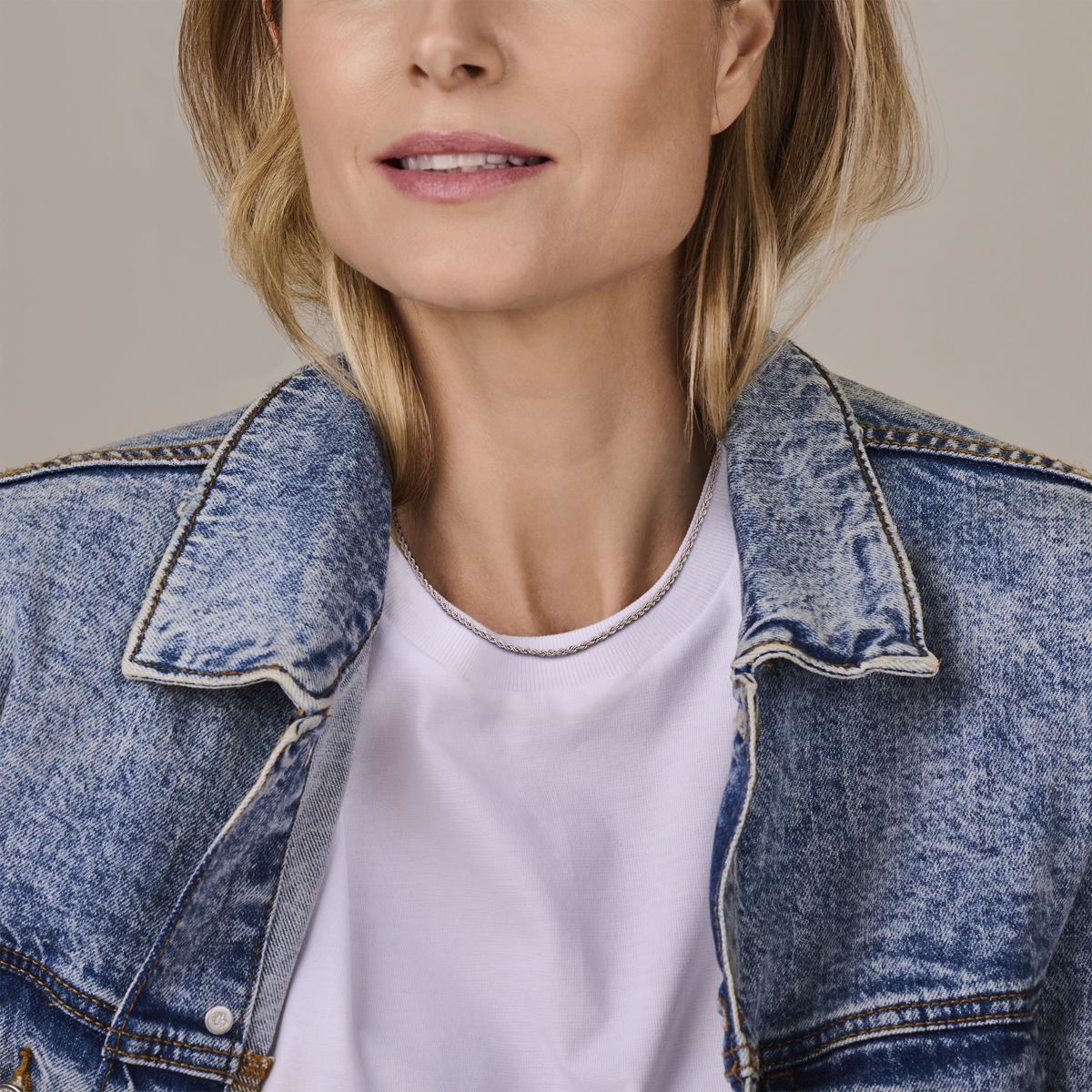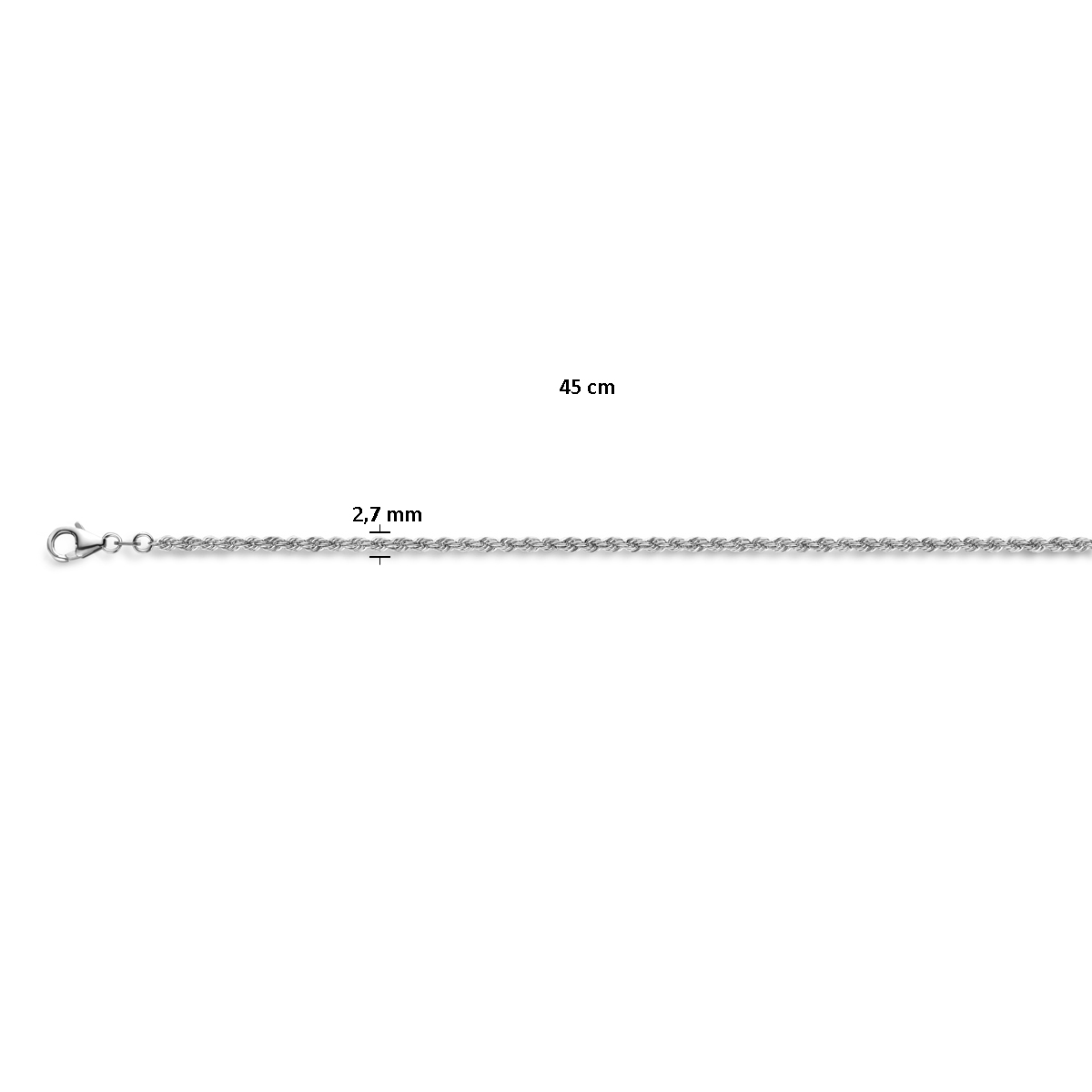Gerhodineerd 925 zilveren lengte artikel met koord schakel. De schakelbreedte is 2.7mm en is uitgevoerd met karabijn sluiting.