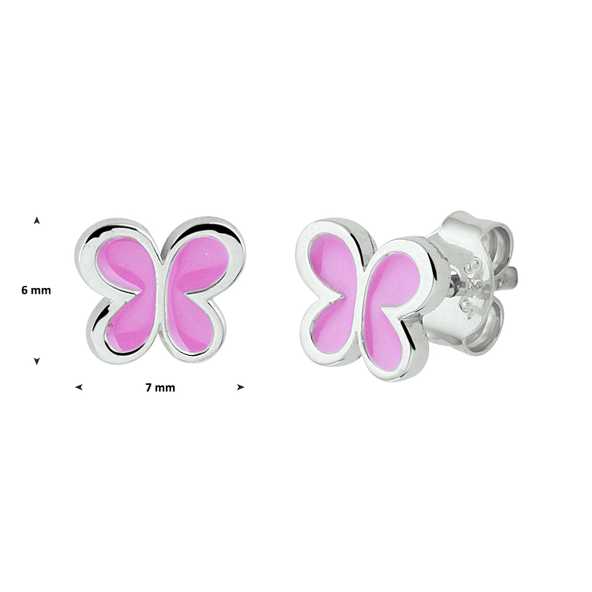 Schattige gerhodineerd zilveren oorknoppen in de vorm van een vlinder uitgevoerd met roze emaille. Info: Gerhodineerd zilver is door de rhodiumlaag beter bestand tegen verkleuren en krassen.